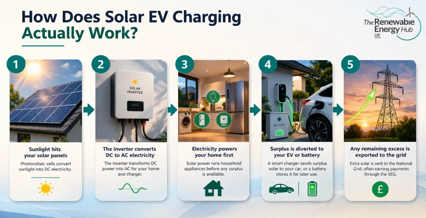 A standard EV charger simply draws electricity from your home supply, whether it comes from solar panels or the grid. A solar-aware charger, however, detects surplus solar generation and sends that extra energy to your car instead of exporting it to the grid.